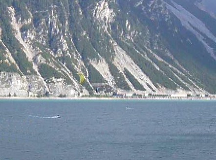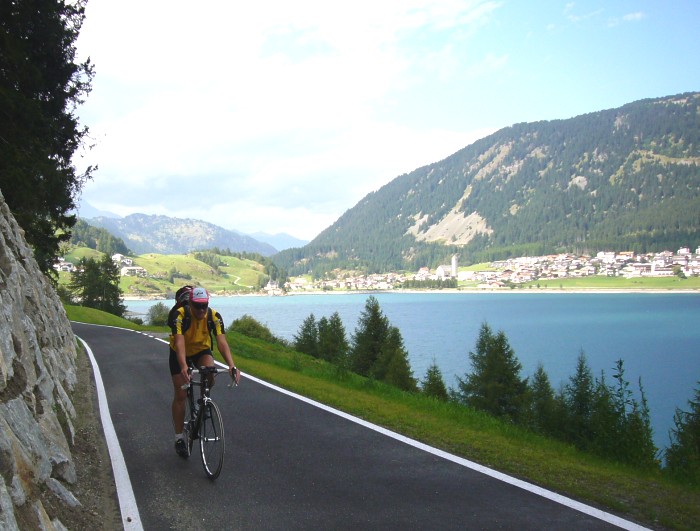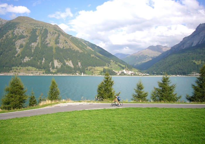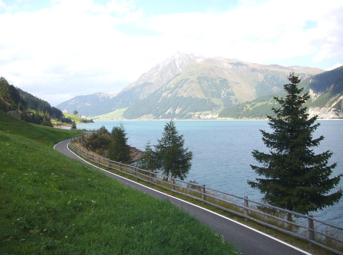 Der neue Radweg entlang des Westufers des Reschensees ist herrvorragend ausgebaut, durchgehend asphaltiert und daher auch für den Rennradler bestens geeignet. Ständig hat man phantastische Ausblicke über den See und meist auch auf die Kitesurfer, die hier ein tolles Revier haben. Da man auf der Ostseite den alten Radweg befahren kann, kann man den Reschensee auch prima umrunden. |