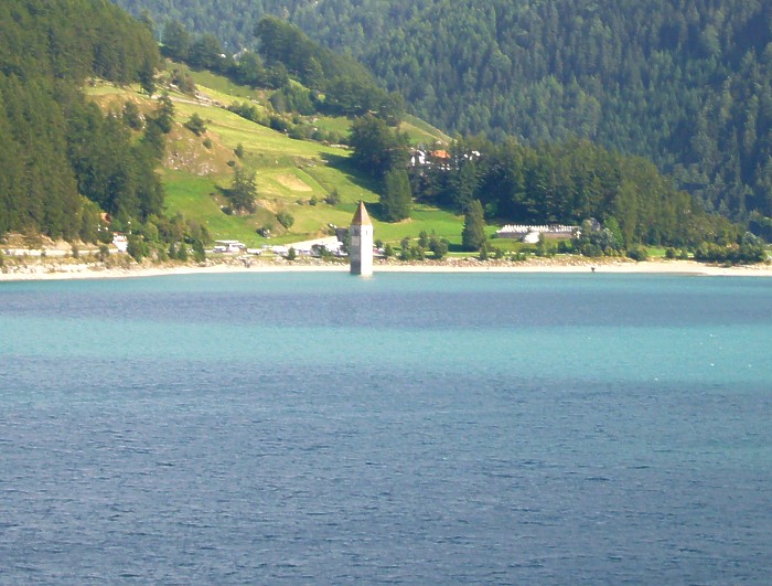 auf der anderen Seite sieht man den versunkenen Kirchturm von Graun