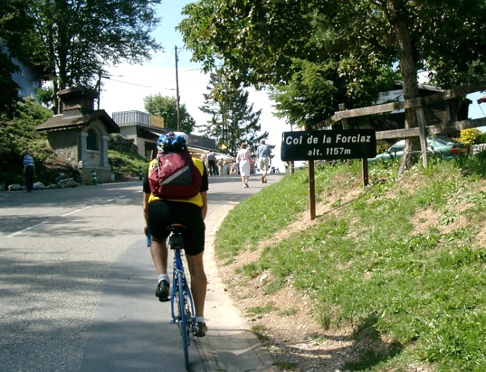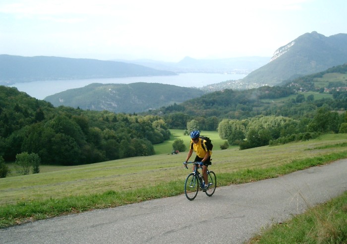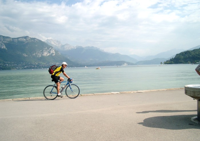 Ein hartes Stück Arbeit ist die Befahrung des Col de la Forclaz auf der Südseite, die auch immer wieder von der Tour de France beradelt wird. 13 % zeigt der Steigungsmesser die ganze Zeit, unterbrochen nur von 2 flacheren Abschnitte, dazu ein Südhang, der Schweiß fließt in Strömen. Ansporn geben die auf die Straße gepinselten Namen der großen Tour-Helden. Von der Passhöhe hat man einen herrlichen Blick über den Lac d'Annecy und dieser begleitet einen auch auf der Abfahrt bis nach Annecy, eine herrliche Stadt mit großzügiger Uferpromenade.