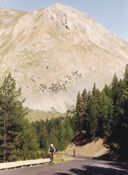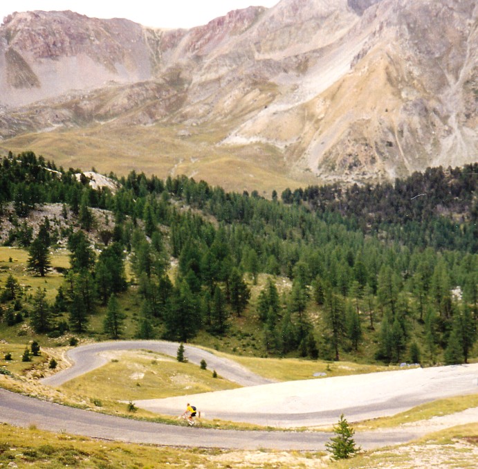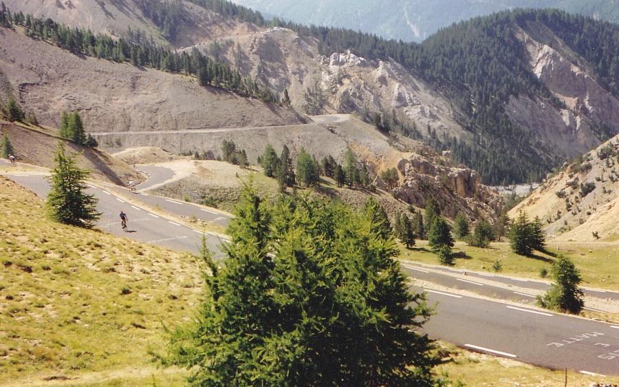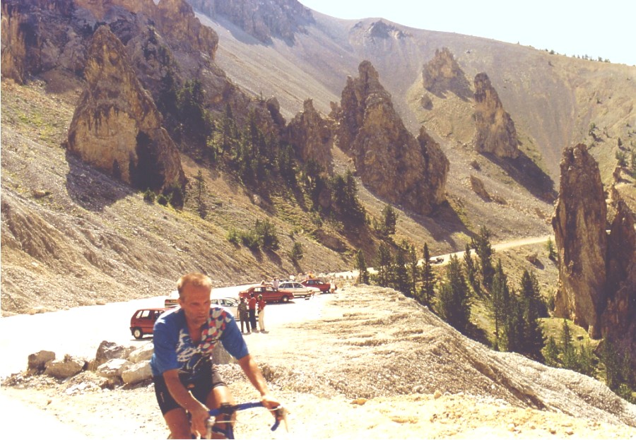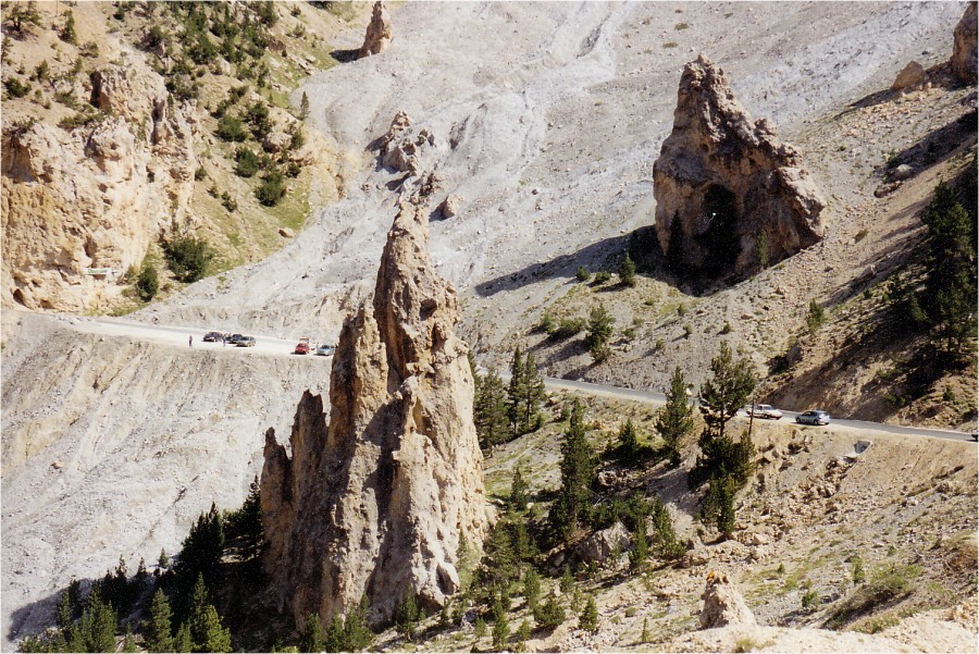 | Prachtstück des legendären Izoard ist die "Casse Déserte" (auf der Südseite kurz vor der Passhöhe) mit Felstürmen in einer Geröllwüste, hier befindet sich auch das Denkmal der Rennradheroen Coppi und Bobet. |