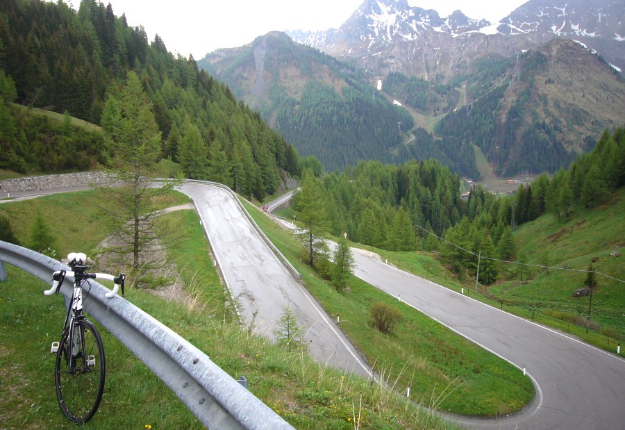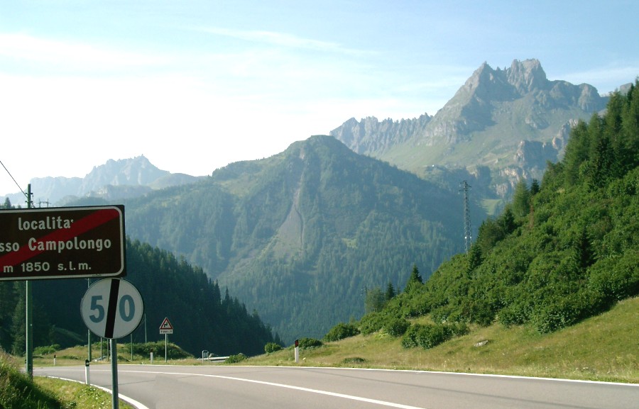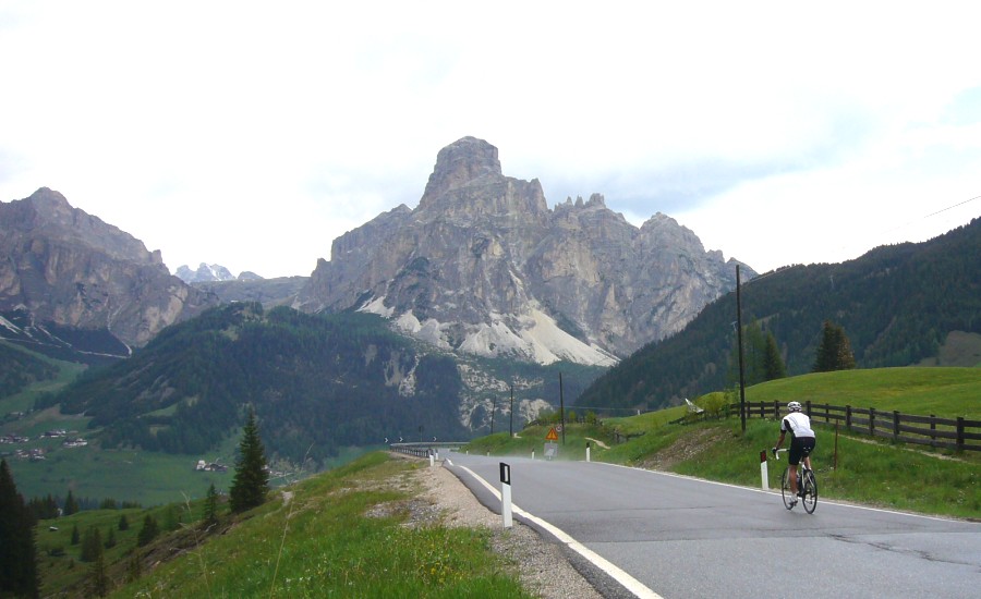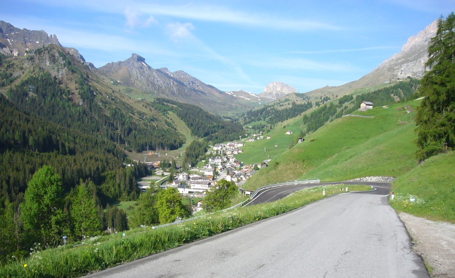 | Kehren- und kurvenreich mit zehn Prozent Steigung führt die Straße aufwärts. In den Kurven grandiose Blicke zurück auf Corvara mit dem 2.665 Meter hohen Sassongher dahinter. Weiter oben wird es flacher, keine Kehren mehr, nach insgesamt sechs Kilometern und 320 Höhenmetern erreicht man die optisch ansprechende Passhöhe. Keine nackten Steine, die Hänge sind grasbewachsen, Nadelbäume stehen in Gruppen. Genau im Süden hebt sich das Weiß der Gletscherfelder der Marmolada beeindruckend gegen das Blau des Himmels ab. Tief unten sieht man die Häuser von Arabba. Auch die Südseite weist schöne Kehren auf. |