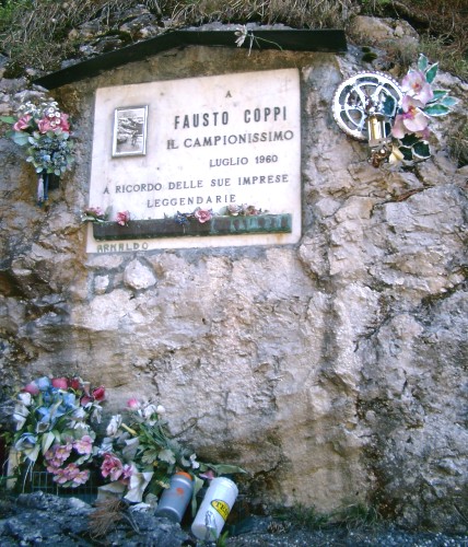 das etwas versteckte Denkmal für den Radheroen Fausto Coppi beim Abzweig zum Sellajoch