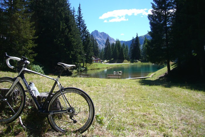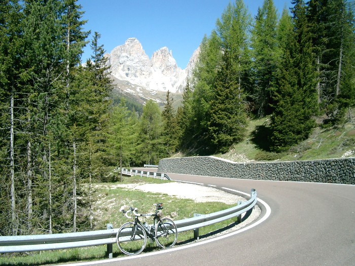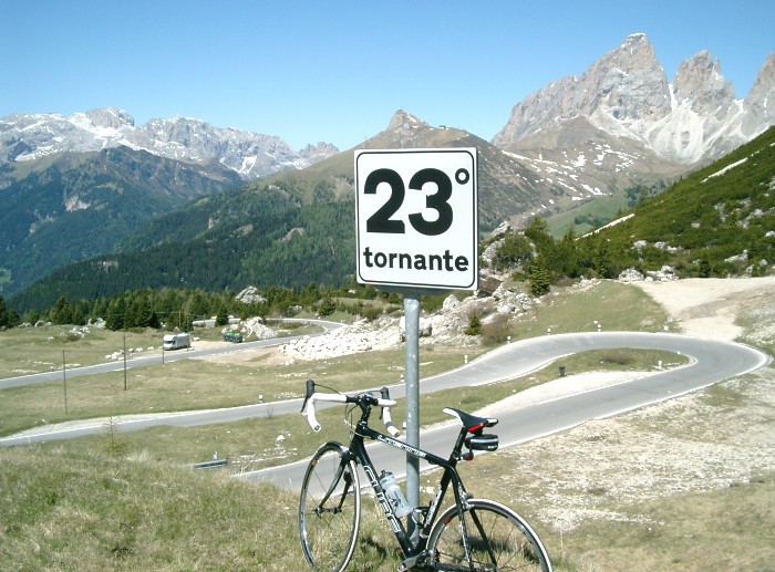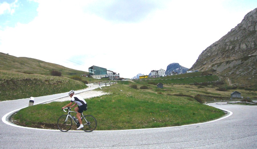 30 schöne Kehren führen anfangs durch lichten Wald später über freies Gelände hinauf zum Joch. Die Steigung ist mit maximal 8 % sehr moderat und man hat daher genügend Muße das herrliche Panorama auf die Dolomitenwände und die Tiefblicke auf Canazei zu genießen. (beim Abzweig zum Sellajoch befindet sich -etwas versteckt- ein Denkmal für den Radheroen Fausto Coppi. Auf dem Podoi ein neues großes, nicht zu übersehendes Denkmal für Fausto Coppi) |