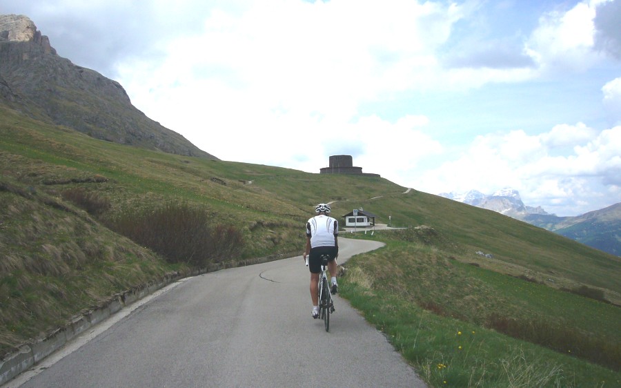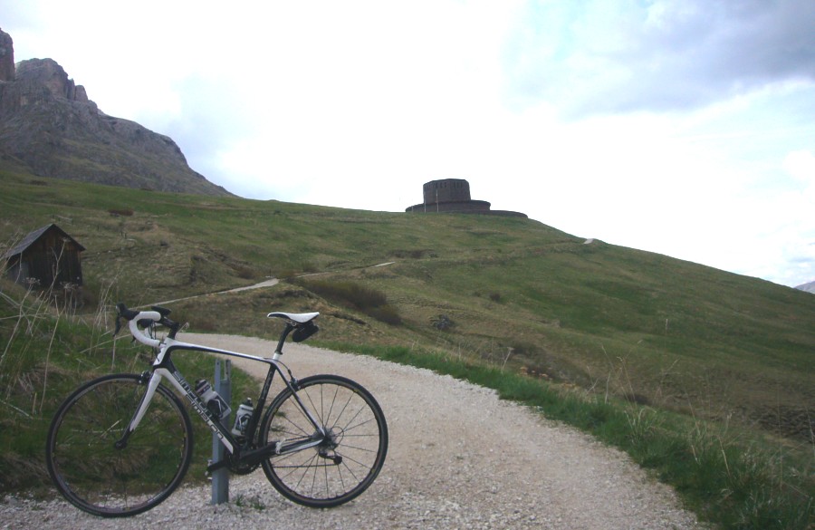 Von der Passhöhe des Pordoi führt ein knapp 1,5 Kilometer langer, asphaltierter Weg zum "Ossario del Pordoi", eine Gedächtnisstätte für über 9000 gefalle deutsche und österreich-ungarischen Soldaten beider Weltkriege. Das runde zweistöckige Monument, auf 2.239 m gelegen, ist vom Pass aus zu sehen. Auf dem Weg dorthin hat man herrliche Panoramablicke und der Abstecher ist überaus lohnend. |