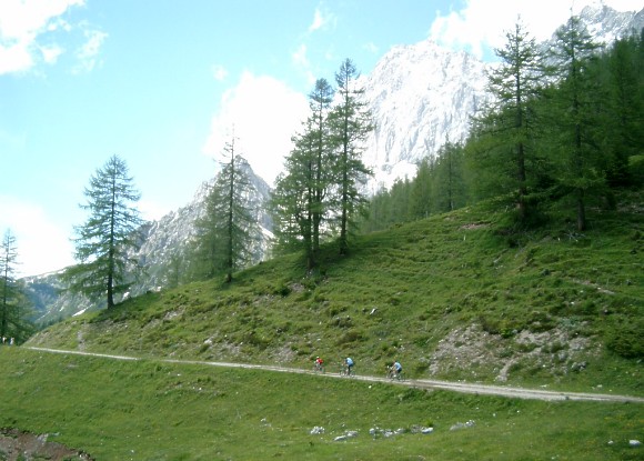 Blick auf den Dachstein (bis zum Fuß der Felswand führt die Straße)