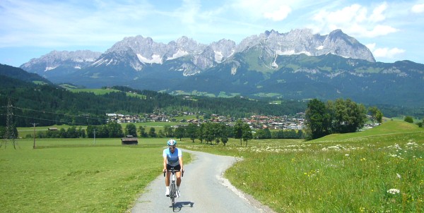 Auf kleinen Wegen mit einem atemberaubendes Panorama zum Wilden Kaiser im Westen und dem Kitzbüheler Horn im Osten von Oberndorf über Weitnau nach St. Johann in Tirol, wo den Radler in der schönen Innenstadt viele Straßencafes zu einem Halt verlocken wollen.