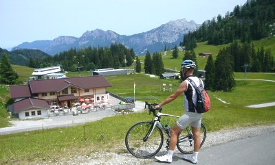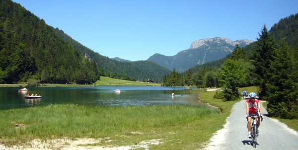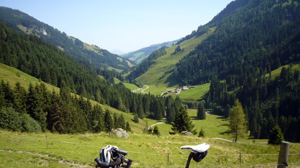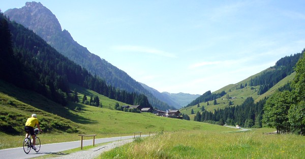 Ohne Verkehr radelt man teils im Wald, meist aber über Wiesen- und Almgelände.