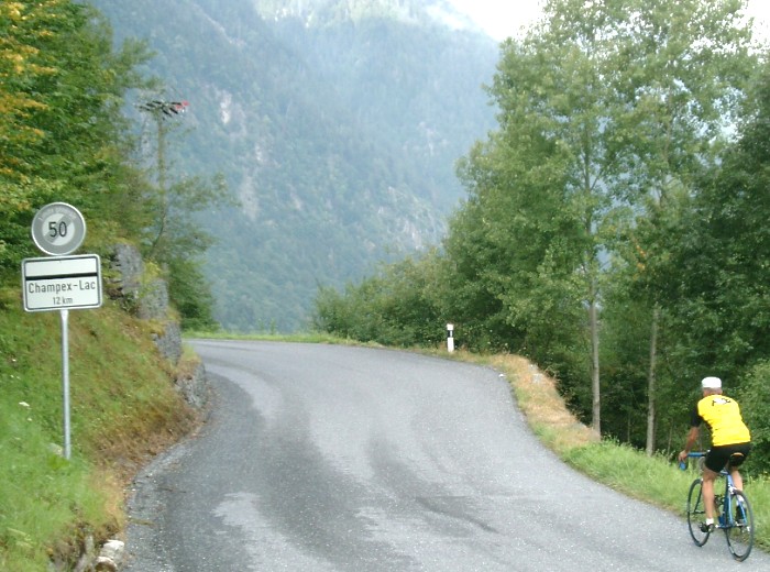 Die Straße über den Champex-Sattel verläuft parallel zur Großen-St. Bernhard-Route und ist kaum befahren. 22 übereinander liegende Kehren sind mit bis zu 13 % Steigung zu durchfahren, anfangs durch und später über der Durnant-Schlucht. Die Aussicht auf der Nordseite ist nicht allzu überwältigend, aber bei der Abfahrt auf der Südseite erhält man großartige Ausblicke auf mehrere schneebedeckte Viertausender wie den 4314 m hohen Grand Combin.