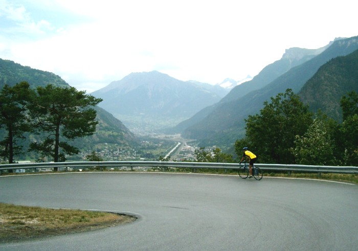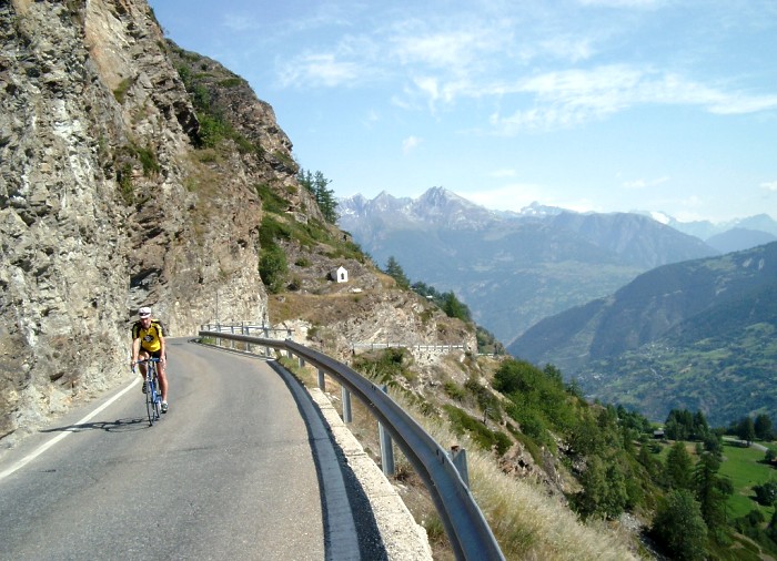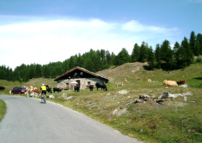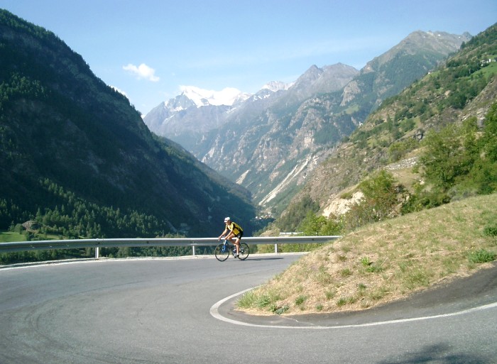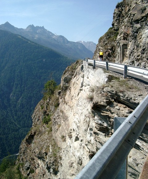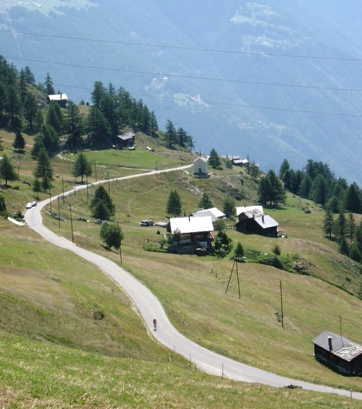 | Die Moosalprunde ist eine überaus lohnende Rennradrunde. Ab Stalden beginnt die Straße in mehreren Kehren einen ca. 500 Meter hohen Steilhang zu überwinden. Phantastisch die Aussicht ins Saas- und Mattertal sowie auf die bis über 4000 Meter aufsteigenden Bergriesen mit ihren firnbedeckten Gipfelregionen. Ab Törbel durchfährt man dann weitläufiges Wiesen- und Almgelände. Die Abfahrt auf der Nordseite weist im oberen Teil meist Wald auf, danach wird die Aussicht aufs Wallis aber ebenfalls wieder überaus beeindruckend.