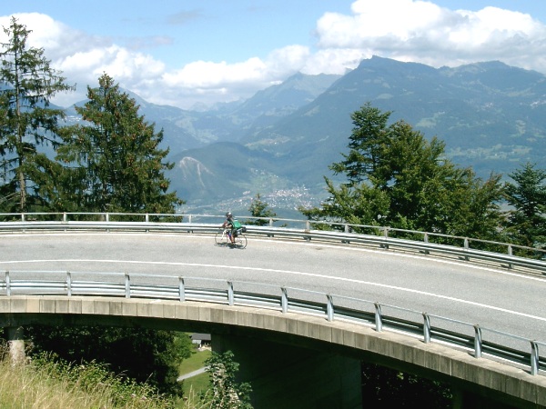| Der Ost-Anstieg vom Rhonetal hinauf zum Pas de Morgins umfaßt rund 1000 Höhenmeter. Da sie über 15 Kilometer verteilt sind, hält sich die Steigung unter 10 % und pendelt meist um die 8 %. Er lässt sich daher recht locker beradeln, zumal die Straße gut ausgebaut ist und immer wieder Tiefblicke hinab ins Rhonetal bietet. Auf dem Pass fährt man in die herrliche und touristisch gut erschlossene Landschaft der Haute Savoie ein.