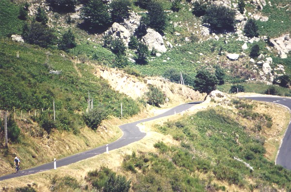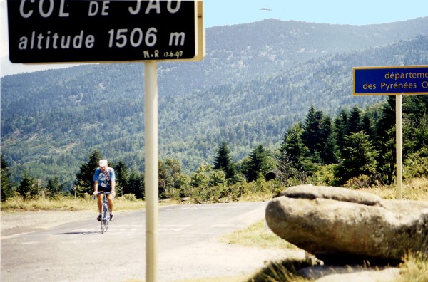 Der relativ unbekannte Col de Jau weist gleich einen Höhenunterschied von 1200 Höhenmeter auf und führt von der Mittelmeerregion in die Pyrenäen. Am schönsten, da irgenwie wildromantisch, ist der untere Teil, oben wird der Pass kehren- und waldreicher und bietet nur mehr wenig Aussicht. Einsam und verlassen kann man das schmale Sträßchen hinaufradeln, ich habe auf meiner Überfahrt keinen anderen Radler getroffen.