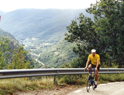 Vom spanischen Bossot aus geht es kurvenreich zum Portillon. Auch wenn die Auffahrt und die Passhöhe meist im Wald liegt, eröffnen sich doch bisweilen schöne Aussblicke ins Tal der Garona (siehe Bild). Die Abfahrt nach Luchon ist sehr wellig! |