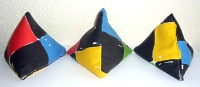 Schneide aus Stoff ein Würfelmuster aus (siehe Bild rechts -Kantenlänge etwa 6 cm) oder 6 einzelne Quadrate, nähe die Kanten zusammen und fülle den Würfel mit Reis.